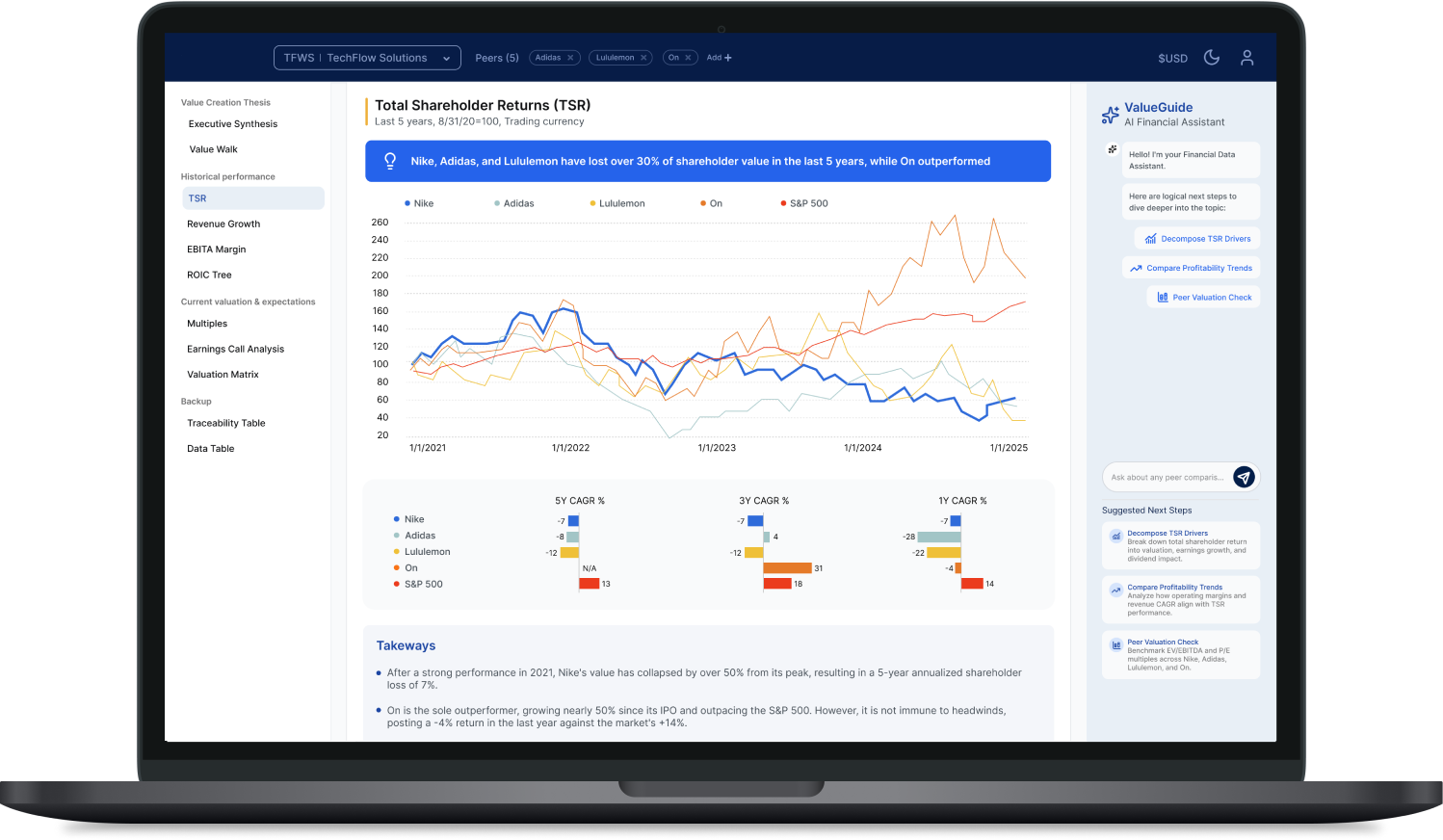 We instantly identify a company's true peer set and benchmark its historical performance on 50+ key metrics, immediately exposing the strategic gaps your team needs to address.